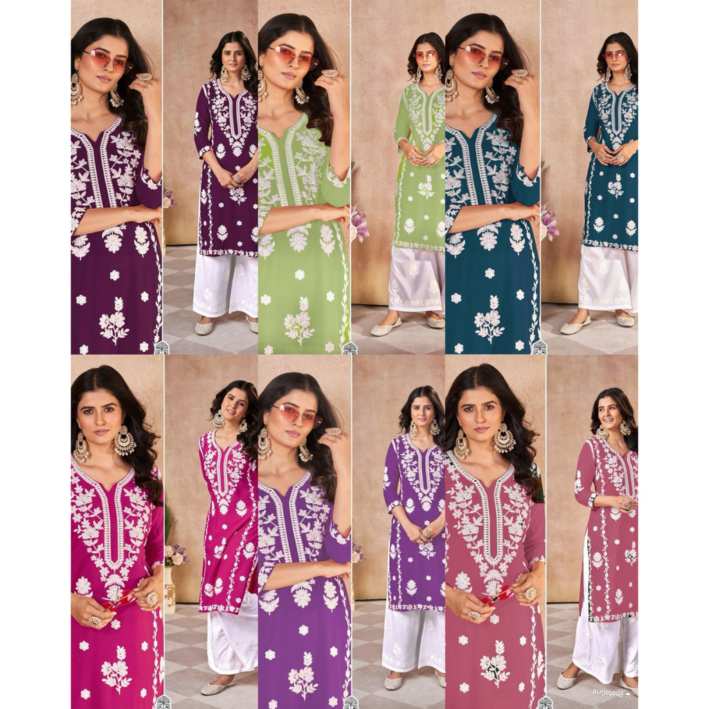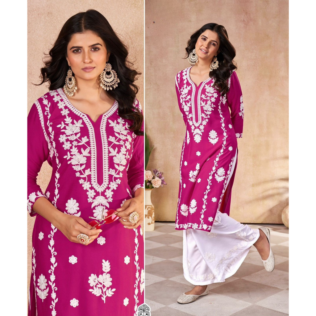 Chikankari Style thread embroidery Rayon Kurti Sets Machine Embroidery chikankari style.