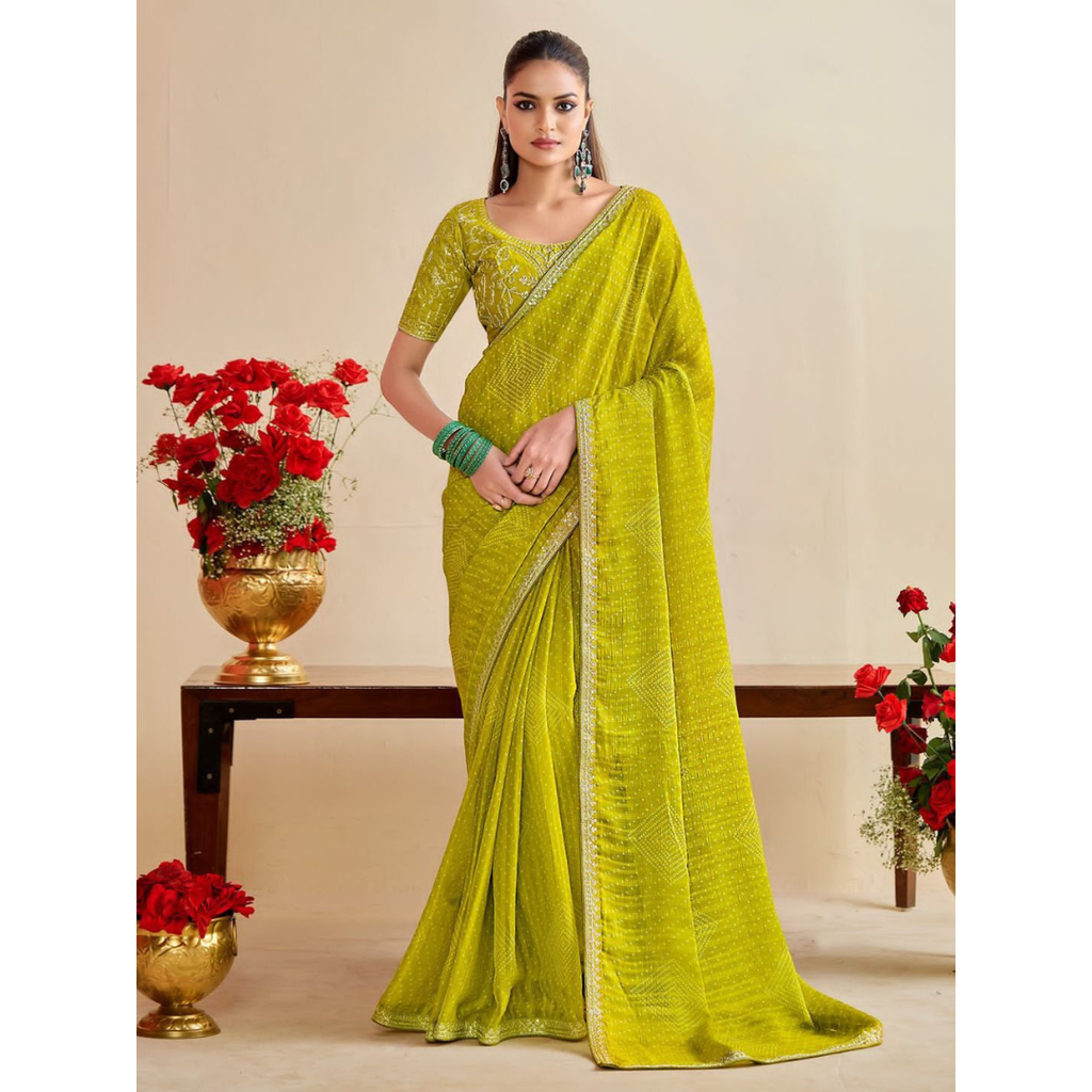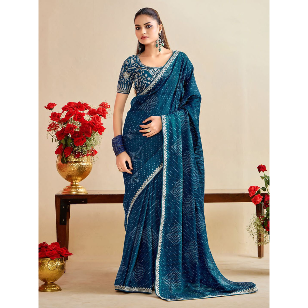 😍Saree look moss chiffon silk bandhani saree with embroidery work saree and blouse With Beautiful Tone colour saree😍