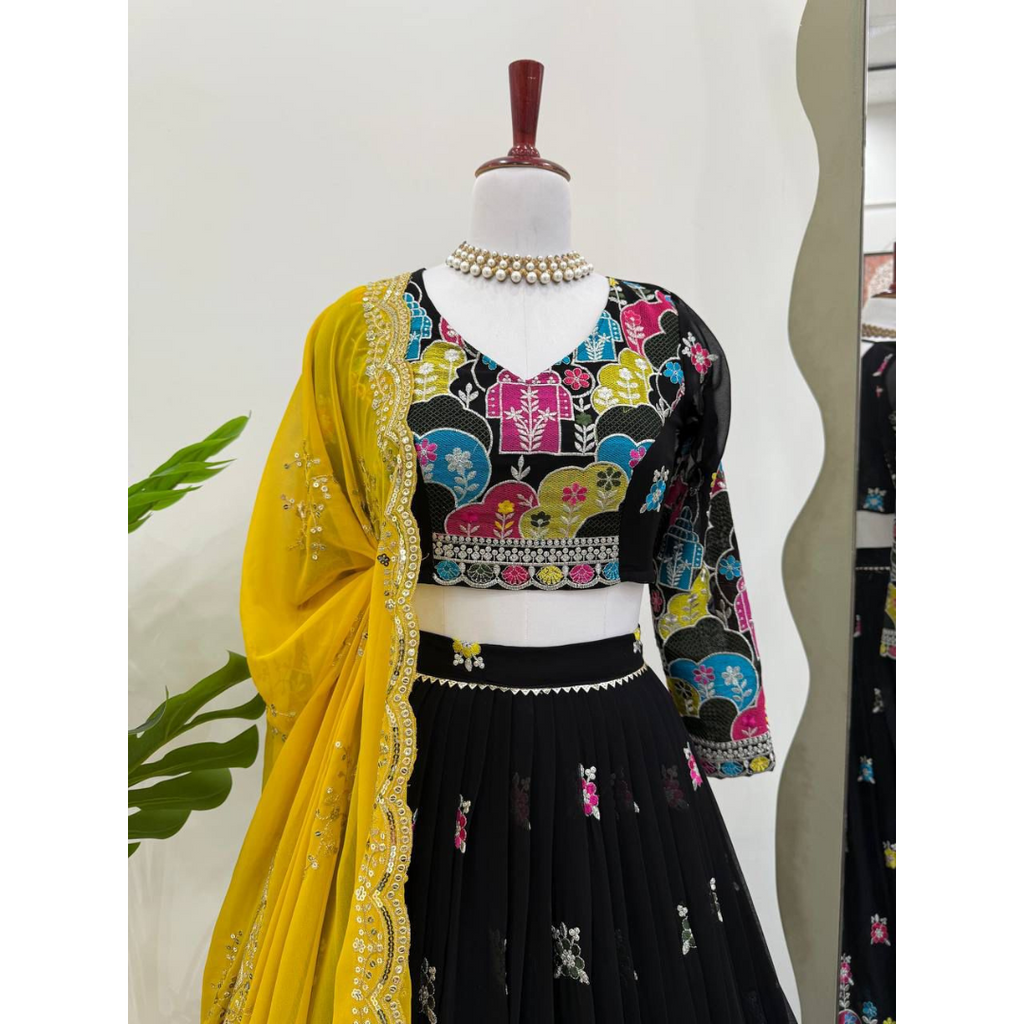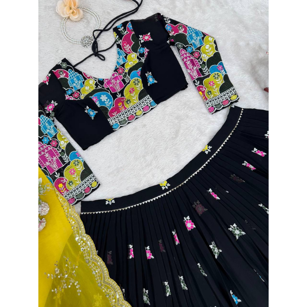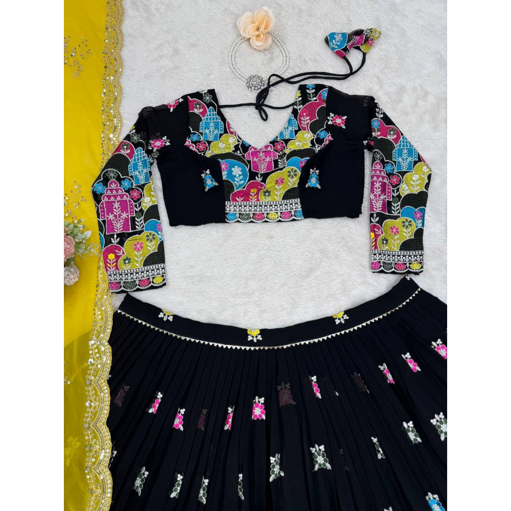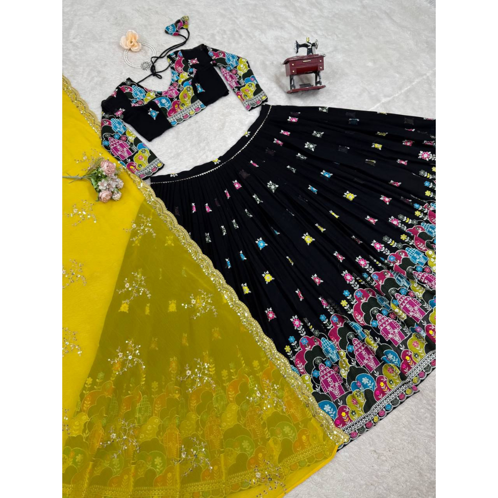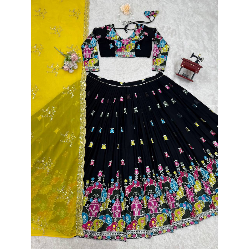 Lehenga made with motifs, embellishment with Zari & Sequins Embroidery Work. Lehenga Style is A-Line with large 4 Mtr flair. Ruffle second layer and height(waist to floor) 43 inches.