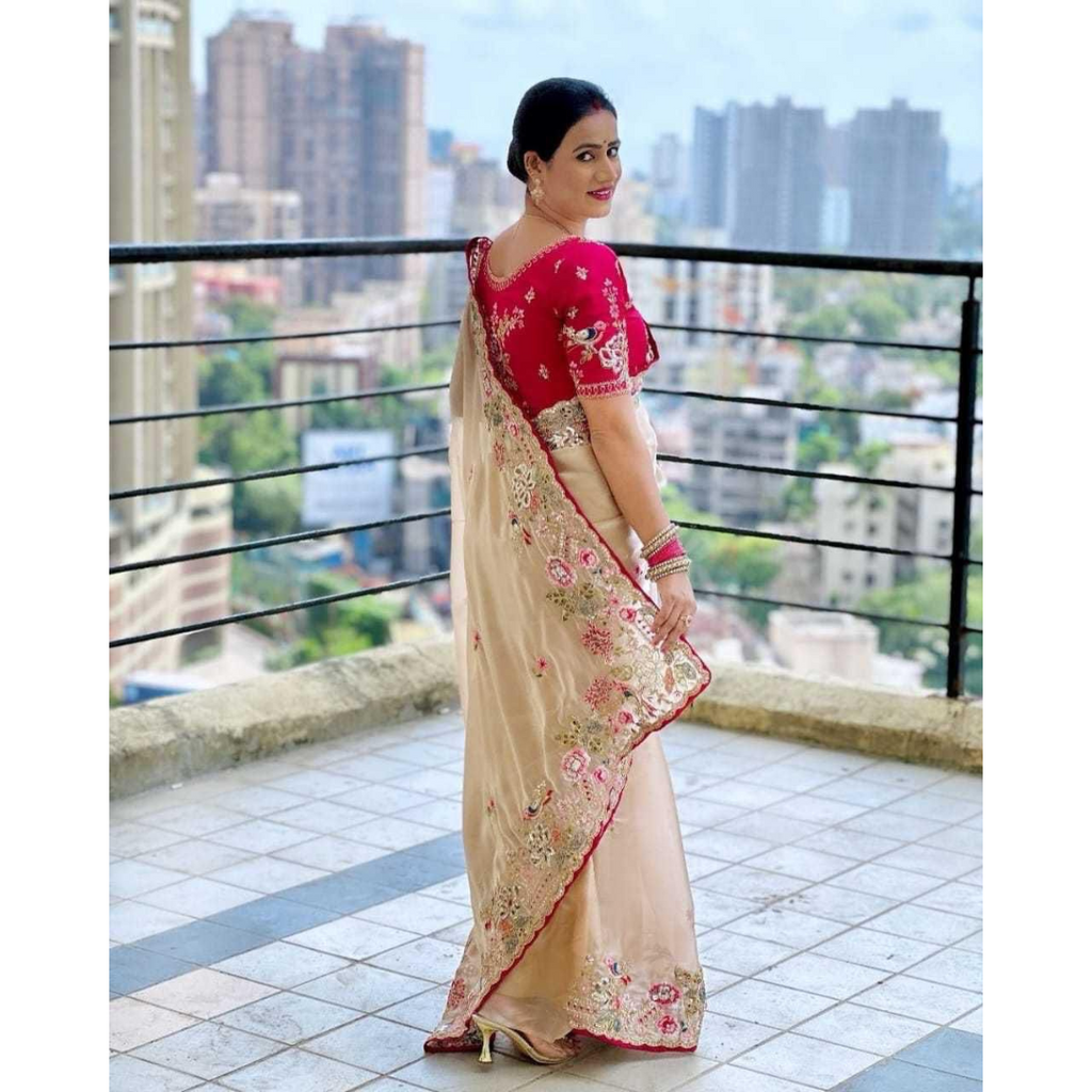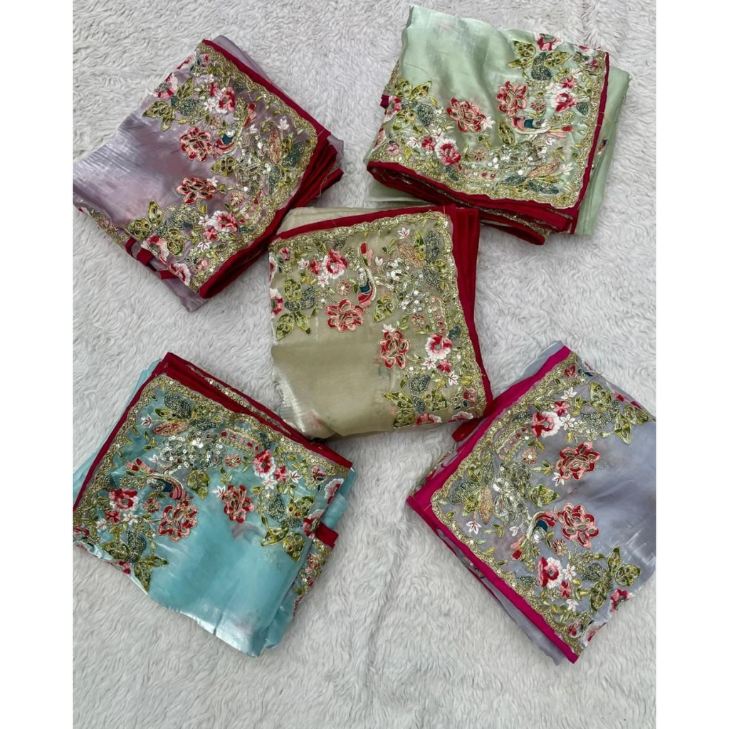 SAREES FABRIC:-Heavy Jimmy Choo fabric multi embroidery threads, coding and sequence & fancy cutwork in work with piping border*